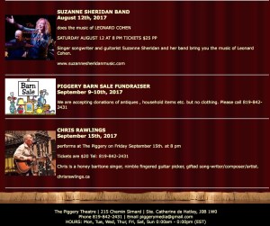 For the third year in the last five years, Suzanne Sheridan has been asked to perform at the glorious Piggery Theatre in the glorious Quebec lakeside resort of North Hatley. On August 12, 2017 The Suzanne Sheridan Band will be performing the music of Canada’s Leonard Cohen and until you hear Suzanne singing Leonard’s “I’m Your Man” you have not experienced one of life’s greatest moments. They love Leonard in Canada, they love Suzanne in Canada, you will love her singing his music. Joining Suzanne in this extraordinary show will be Bob Cooper on keyboards, Joe Meo on sax and clarinet, and Jake Habegger on drums. Suzanne is on vocals and guitar.