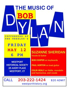 SUZANNE SHERIDAN AT THE WESTPORT HISTORICAL SOCIETY http://westporthistory.org/events/coffeehouse-at-the-wheelers-3/ with BOB COOPER, SUE BROUDY, and NANCY BURGER